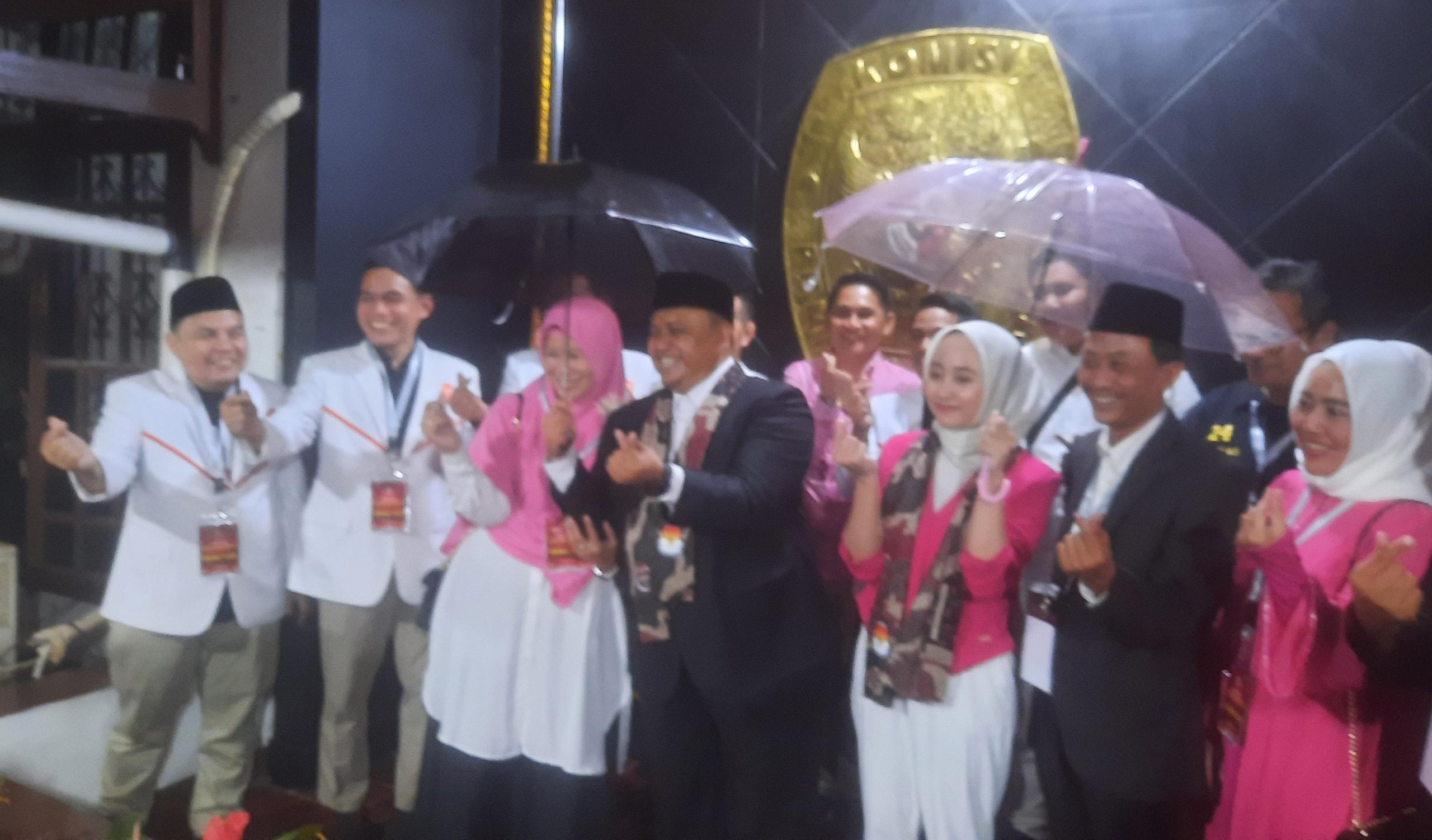 Usai pendaftaran, Atang memakai payung sebagai lambang kampanyenya bersama Annida Alivia.