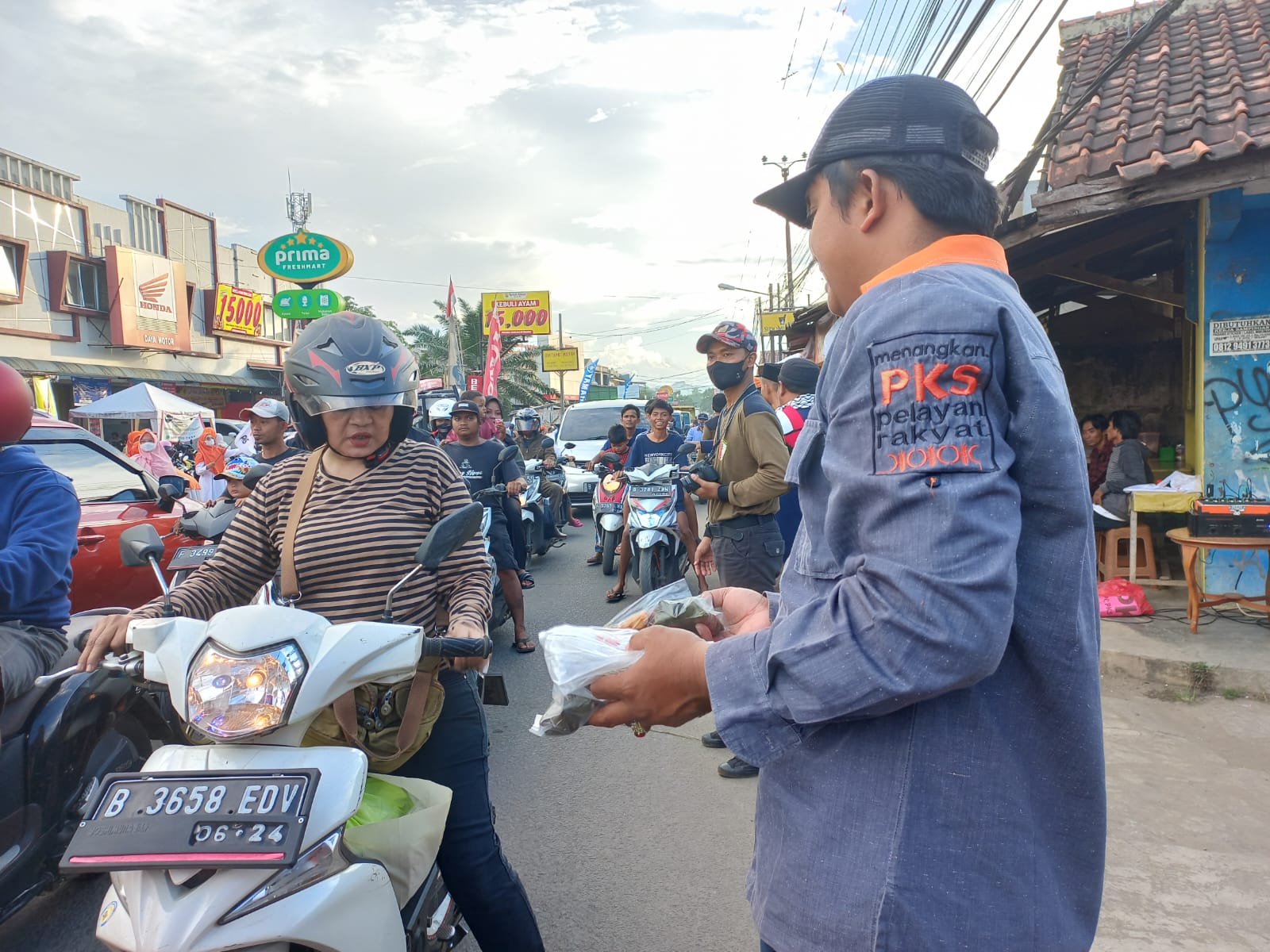 Bogor – Dewan Pimpinan Cabang (DPC) Partai Keadilan Sejahtera (PKS) Parung menebar 3500 paket ta’jil bagi masyarakat yang lewat di sepanjang jalan raya Haji Mawi atau lebih tepatnya di Desa Bojong Indah hingga Desa Bojong Sempu, Kecamatan Parung, Minggu (09/04/2023).
