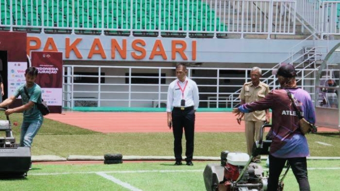 Kadispora Kabupaten Bogor, Asnan AP (Kemeja Putih) saat meninjau di lapangan Stadion Pakansari Cibinong, pada Senin (19/02/24).