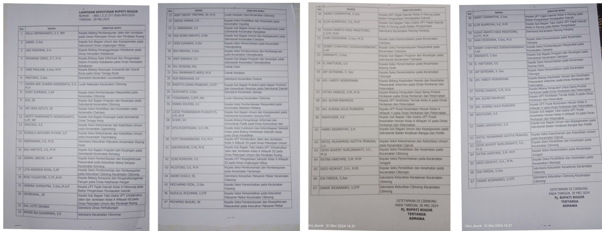 Pj Bupati Bogor Asmawa Tosepu mengungkapkan, bahwa pihaknya yang telah melaksanakan pelantikan pejabat administrator dan pengawas sebanyak 67 orang. Dimana, pelantikan ini telah melalui tahapan dan mekanisme sesuai ketentuan peraturan perundangan-undangan yang ada.