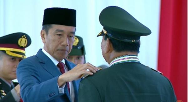 Setelah itu, Jokowi menyematkan lencana dan tanda bintang di bahu dan pundak Prabowo yang mengenakan seragam TNI lengkap.